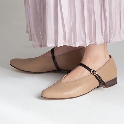 ストラップが取り外し可能の2WAY仕様のパンプス。 履き口にはステッチの見えない縫製方法を採用。